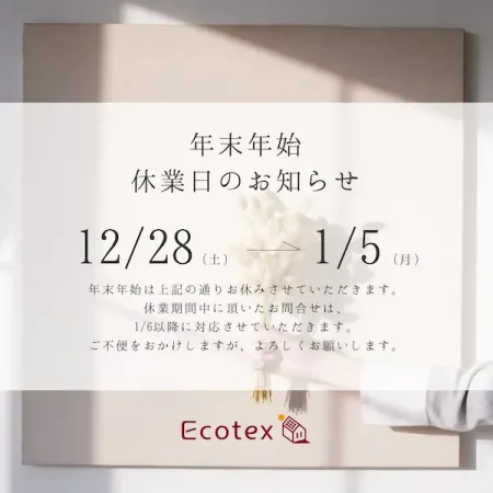年末年始休業のご案内 年末年始の休業のお知らせ 拝啓 師走の候、ますますご健勝のこととお喜び申し上げます。平素は格別のご高配を賜り、厚くお礼申し上げます。 さて、株式会社エコテックスでは年末年始の休業日につきまして、下記のとおり休業日とさせていただきます。皆様には大変ご迷惑をおかけいたしますが、ご了承いただきますようお願い申し上げます。 敬具 記 ■年末年始休業日2024年12月28日(土)~2025年1月5日(日) ※2024年1月6日(月)より、通常営業を開始いたします。 ■休業期間中の、お問合せ・ご相談などは、フリーダイヤル:0120-060-456へ(24時間・365日受付) ■「公式LINEアカウント」へご登録いただき、LINEでのご連絡がとても便利となっております